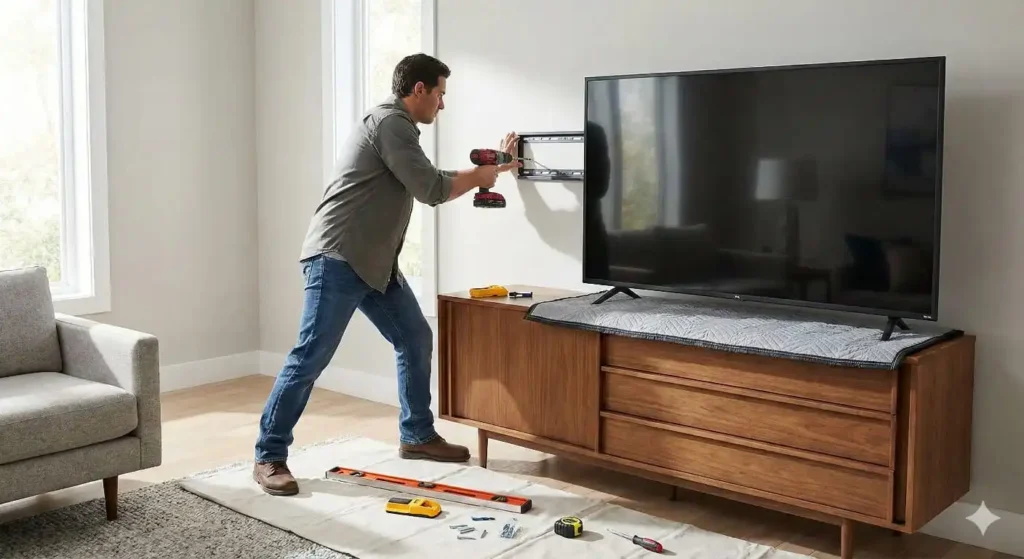 Safe & neat TV wall mounting, bracket fitting aur wire management included.